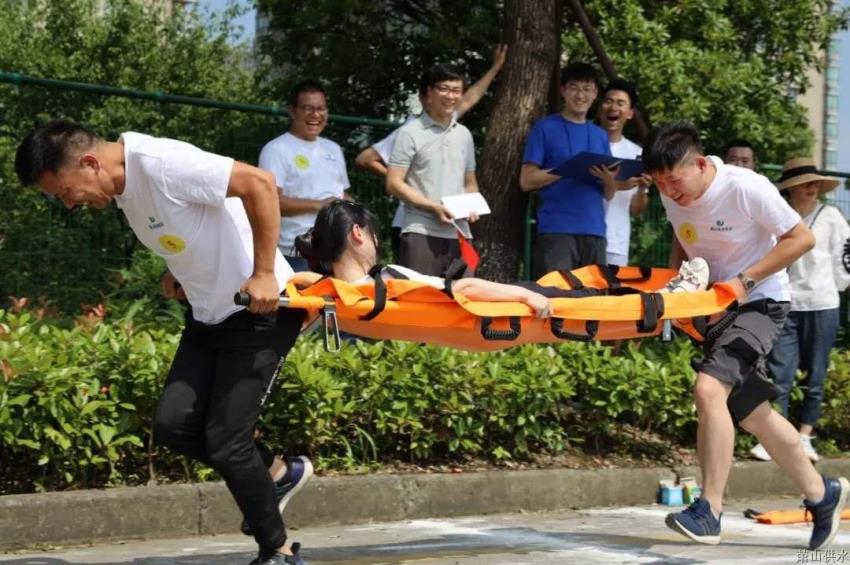 两名队员为一组,听到开始命令后,队员拆开担架包,迅速跑至30米外伤员所在处,凭据要求将伤员牢固后送至救援处,最后将担架送回终点线。
