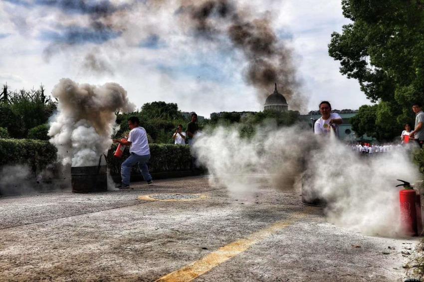 三名队员为一组,听到开始命令后,第一名队员手持灭火器跑向喷射区域,凭据规范将灭火器上下翻转三次,拔出包管销,一手握住压把,一手托住灭火器底部,瞄准火焰根部进行喷射,灭火后返回起跑线与下一名队员击掌,下一名队员方可出发重复上述操作,直至第三名队员回到起跑线。